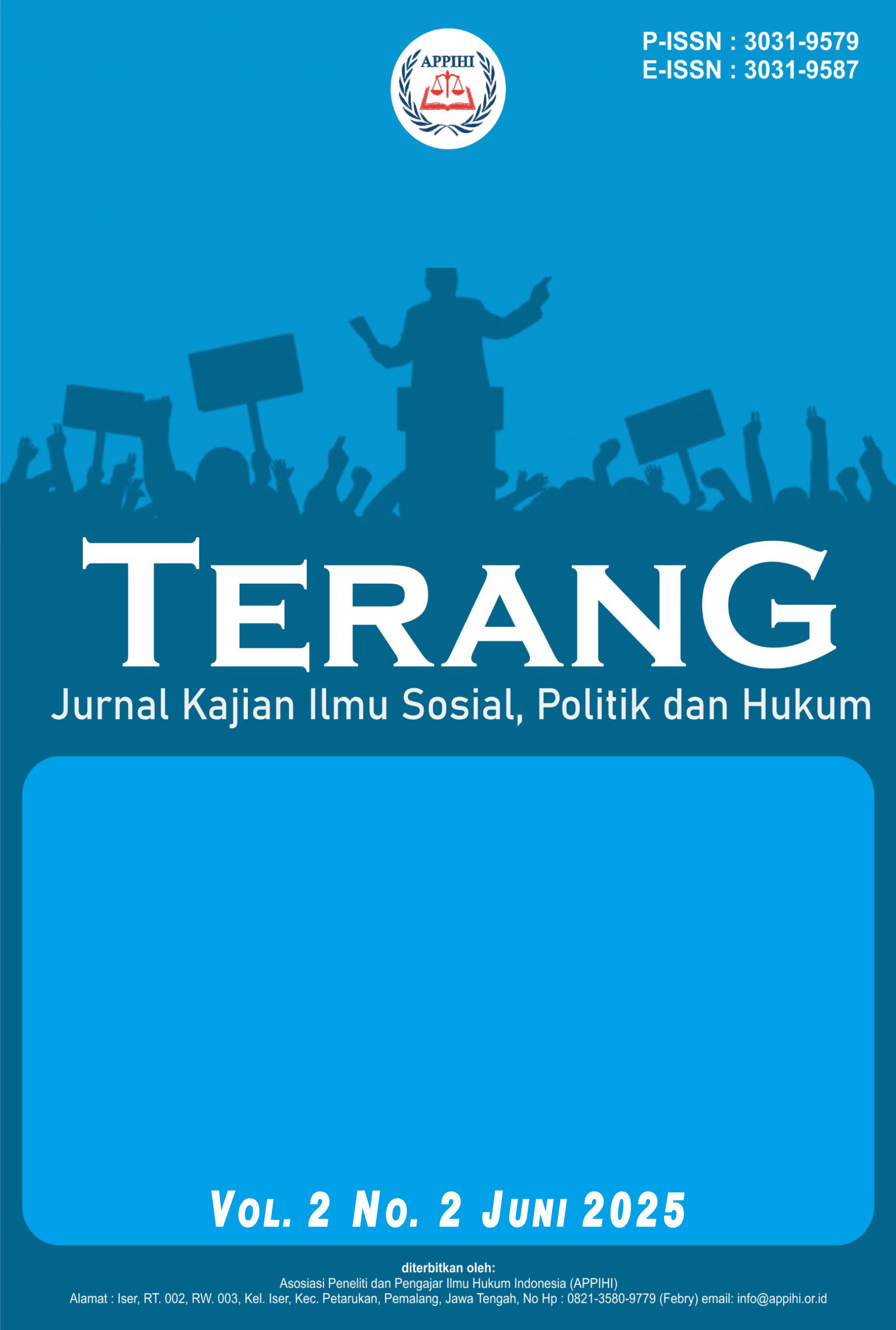 Vol. 2 No. 2 (2025)Terang : Jurnal Kajian Ilmu Sosial, Politik dan Hukum, adalah jurnal akademik yang diterbitkan 4 kali dalam setahun (Maret, Juni, September dan Desember) oleh Asosiasi Peneliti dan Pengajar Ilmu Hukum Indonesia. Jurnal ini menerbitkan penelitian asli tentang berbagai konsep, teori, perspektif, paradigma, dan metodologi dalam studi Politik dan Komunikasi.
